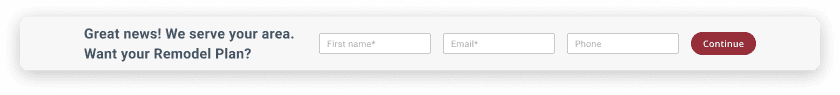 Great news! We serve your area. Want your Remodel Plan? [ First name ] [ Email ] [ Optional Phone ] → [ Continue ]